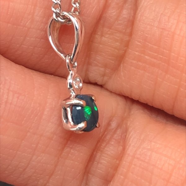 $1,100.00Original price was: $1,100.00.$680.00Current price is: $680.00.Love Magic – 18k White Gold Solid Black Opal Pendant with Diamond 534
