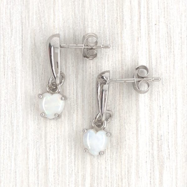 These delicate heart dangle earrings are made of 100% genuine White Opal and Sterling Silver (925). The heart shaped opal showcases the different colours as it dangles in the light.